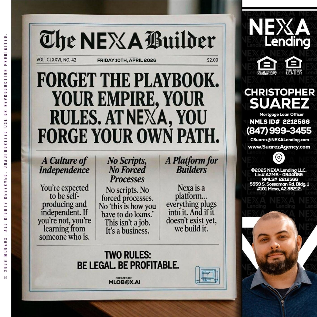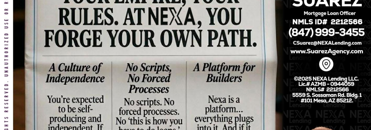 Hi, my name is Christopher Suarez. I’m a Loan Officer with NEXA Lending LLC., offering personalized mortgage solutions, fast customized quotes, great rates and service with integrity.